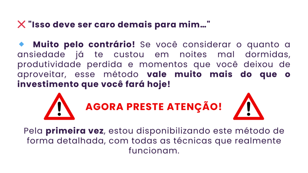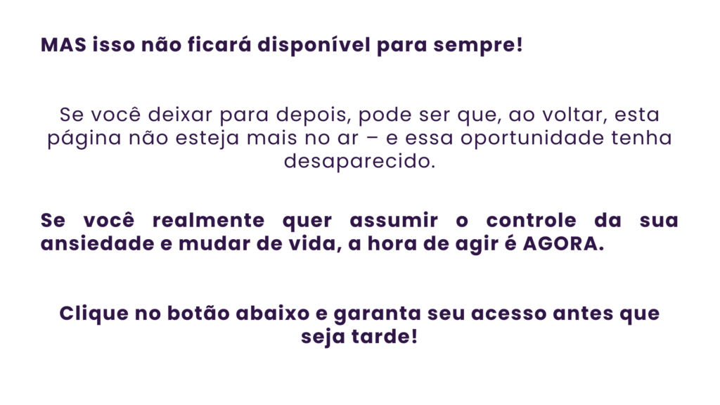 Invista em você mesmo e experimente a diferença. Imagine a tranquilidade de acordar cada dia com uma mente clara e um coração leve. Não deixe a ansiedade controlar sua vida — comece a transformação hoje!
