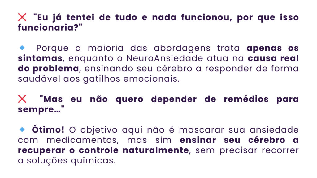 Baseado na neurociência, desenvolvemos um método comprovado para reprogramar seu cérebro e quebrar o ciclo da ansiedade, trazendo de volta sua paz e sua liberdade.